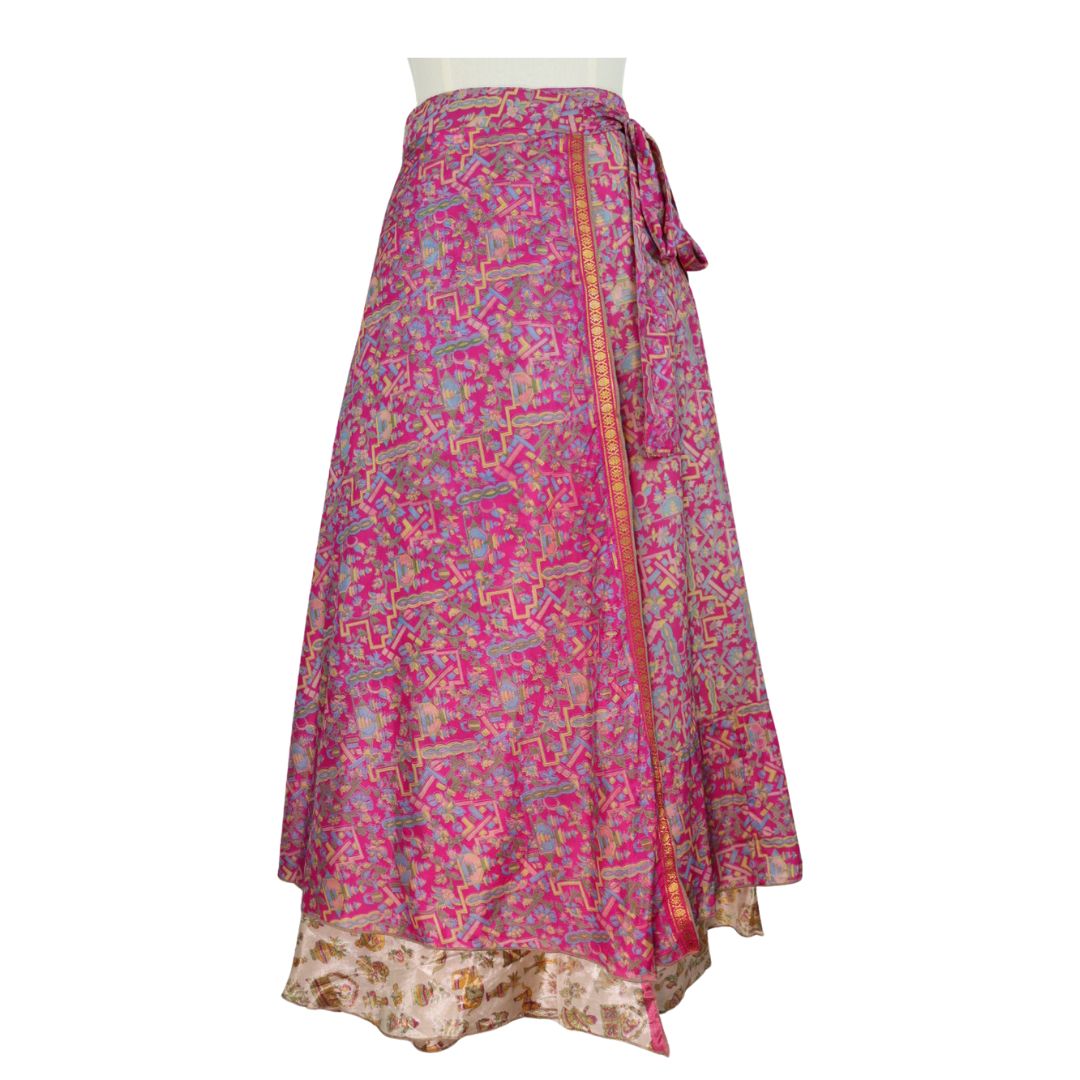 Traditionally Saris are often flamboyant and brightly coloured, frequently embroidered, and made from silk, cotton, or, in recent years, synthetic cloth such as viscose and polyester. We use retro Sari cloth in the majority of our garments so silk is a high component. It is not uncommon to find chiffon or georgette added into the mix which is why we refer to the skirts as a silk blend. We also use 'end of roll' sari fabrics.