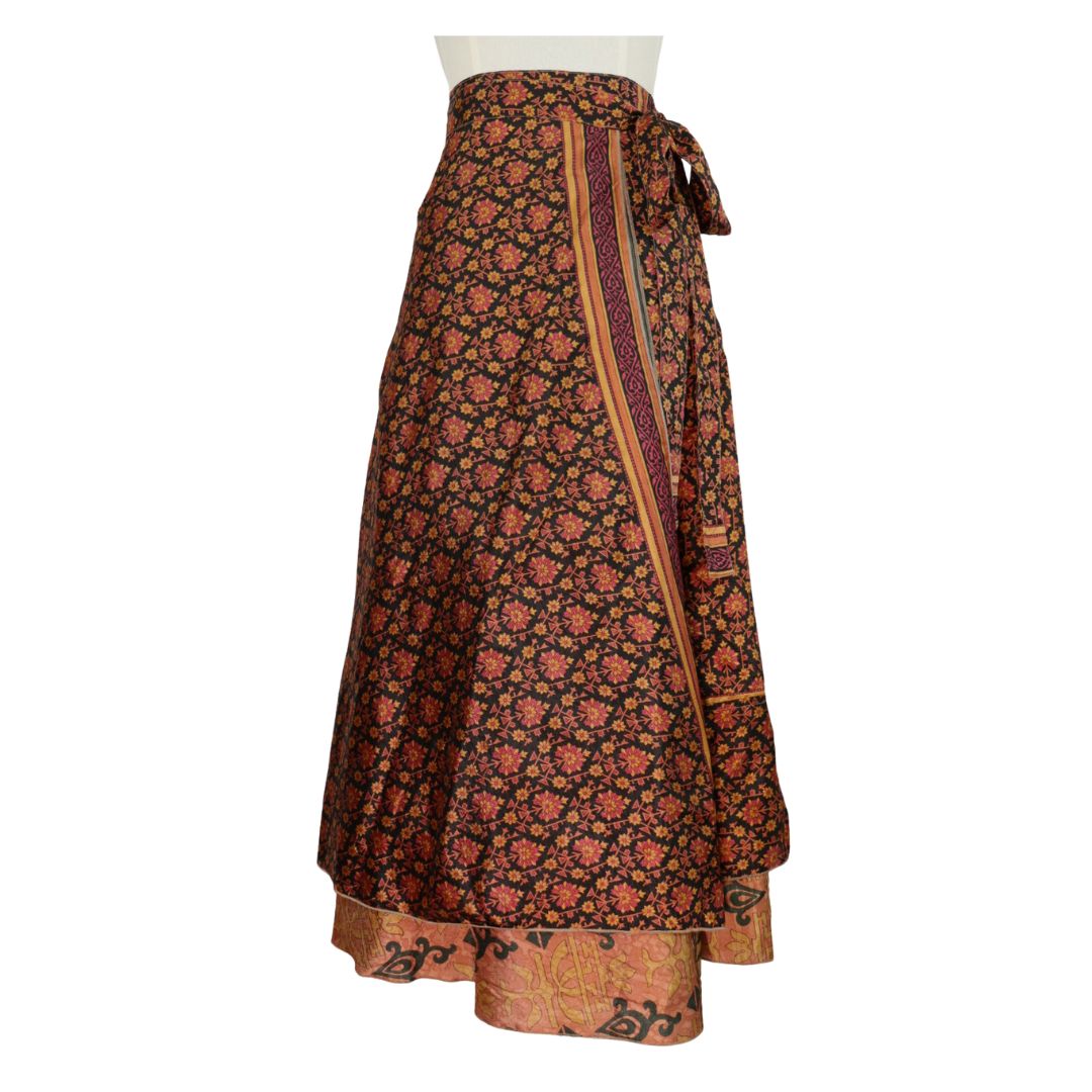 Traditionally Saris are often flamboyant and brightly coloured, frequently embroidered, and made from silk, cotton, or, in recent years, synthetic cloth such as viscose and polyester. We use retro Sari cloth in the majority of our garments so silk is a high component. It is not uncommon to find chiffon or georgette added into the mix which is why we refer to the skirts as a silk blend. We also use 'end of roll' sari fabrics.