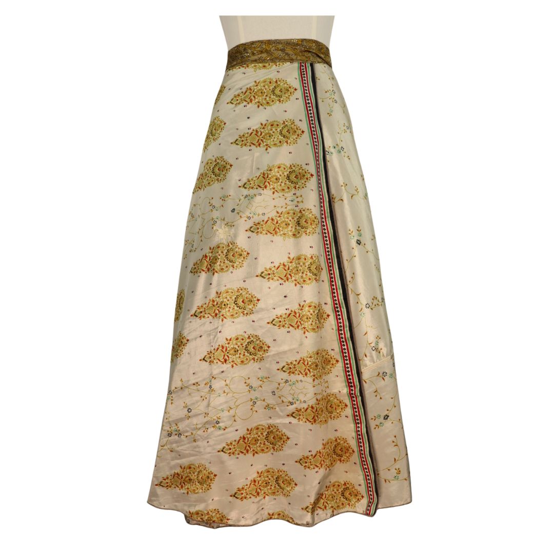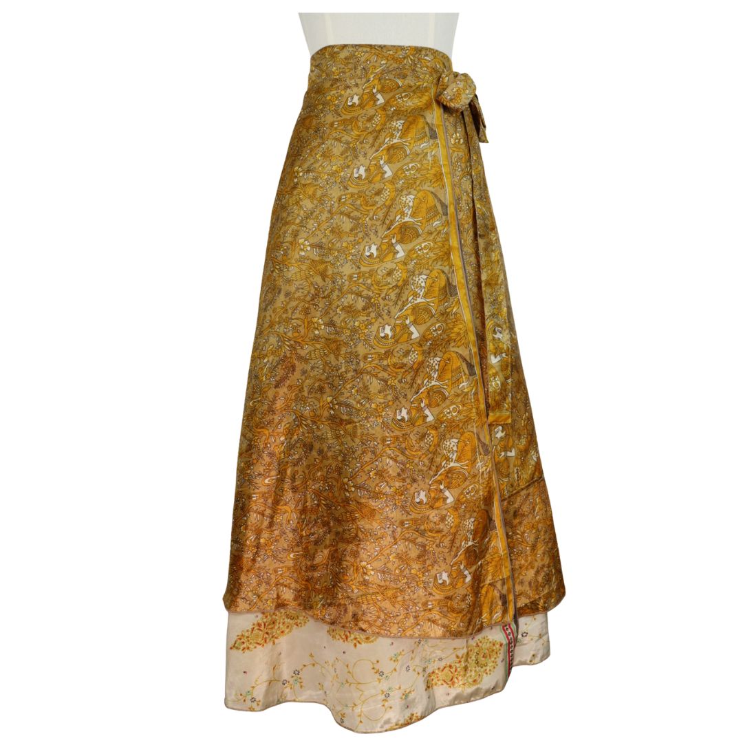 Traditionally Saris are often flamboyant and brightly coloured, frequently embroidered, and made from silk, cotton, or, in recent years, synthetic cloth such as viscose and polyester. We use retro Sari cloth in the majority of our garments so silk is a high component. It is not uncommon to find chiffon or georgette added into the mix which is why we refer to the skirts as a silk blend. We also use 'end of roll' sari fabrics.