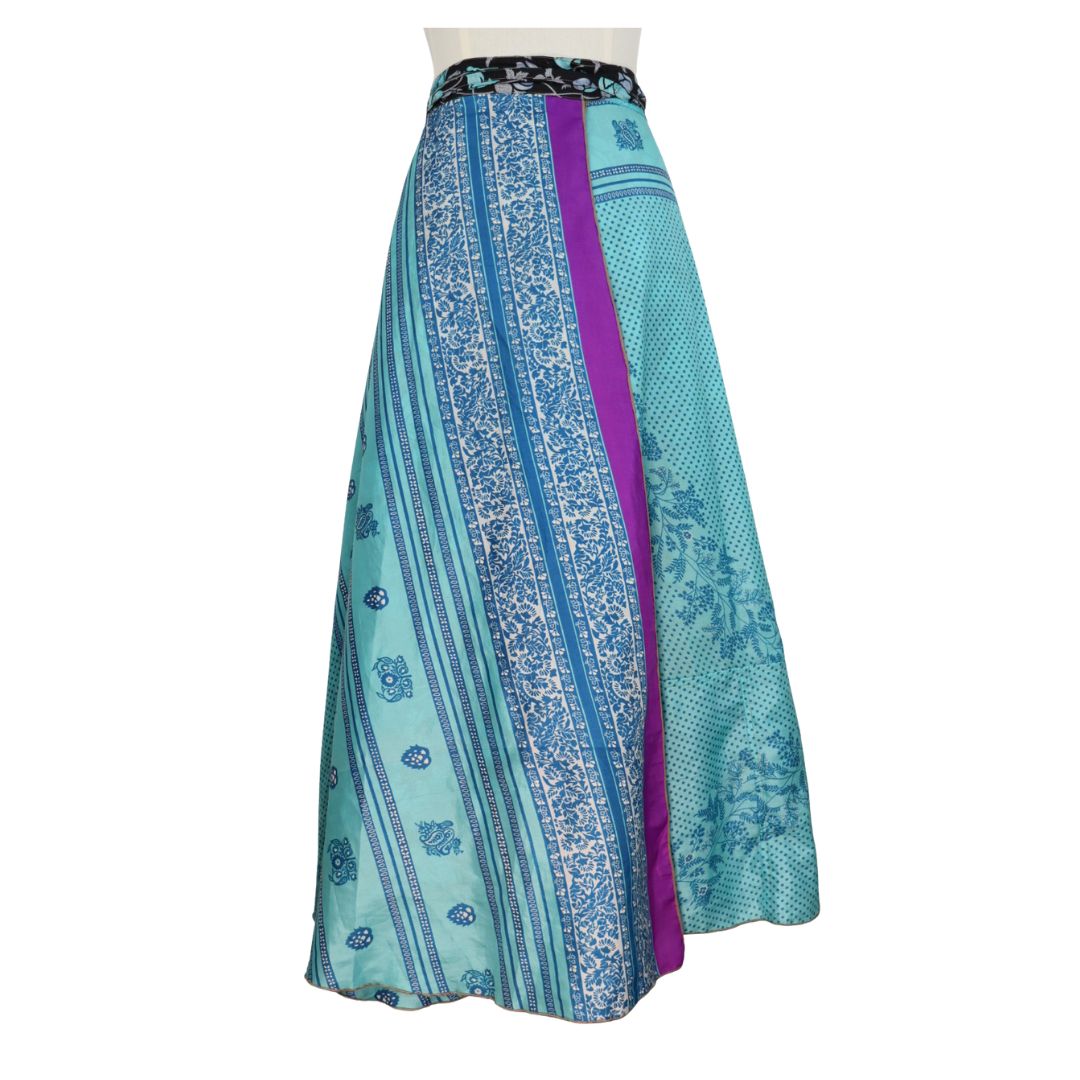 Traditionally Saris are often flamboyant and brightly coloured, frequently embroidered, and made from silk, cotton, or, in recent years, synthetic cloth such as viscose and polyester. We use retro Sari cloth in the majority of our garments so silk is a high component. It is not uncommon to find chiffon or georgette added into the mix which is why we refer to the skirts as a silk blend. We also use 'end of roll' sari fabrics.
