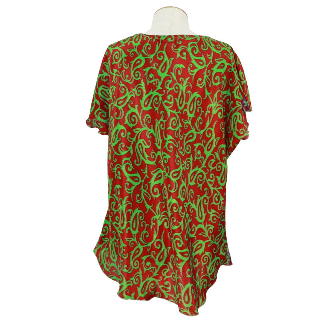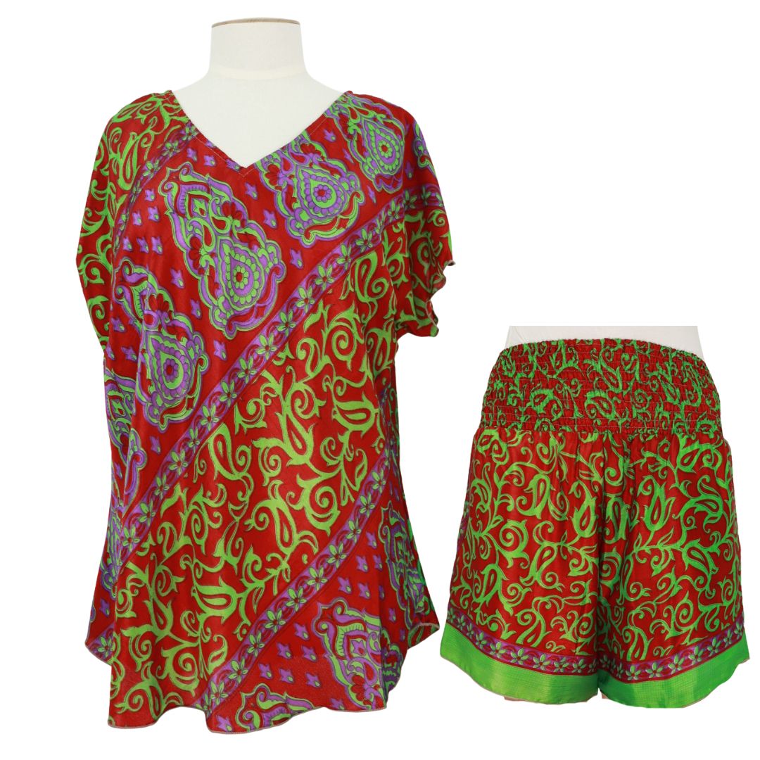 A beautiful set suitable for either sleepwear or lounge wear. Plus, since both pieces are made from the same sari fabrics we use for shorts and blouses, you can also wear the top and shorts separately. The top is very similar to our current short sleeve blouse.