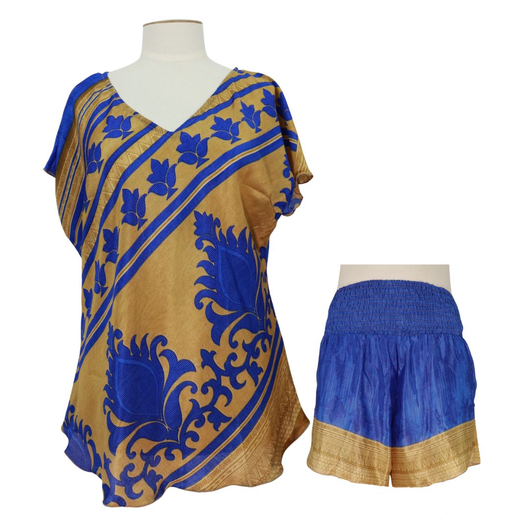 A beautiful set suitable for either sleepwear or lounge wear. Plus, since both pieces are made from the same sari fabrics we use for shorts and blouses, you can also wear the top and shorts separately. The top is very similar to our current short sleeve blouse.