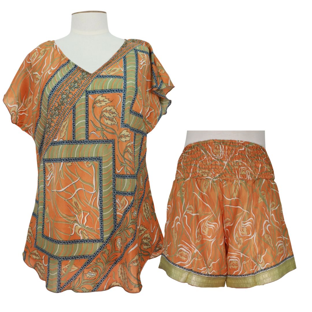 A beautiful set suitable for either sleepwear or lounge wear. Plus, since both pieces are made from the same sari fabrics we use for shorts and blouses, you can also wear the top and shorts separately. The top is very similar to our current short sleeve blouse.