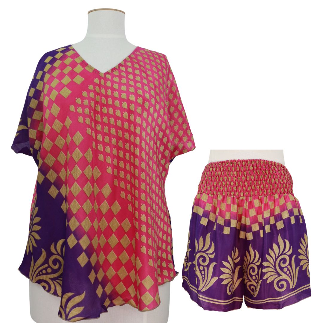 A beautiful set suitable for either sleepwear or lounge wear. Plus, since both pieces are made from the same sari fabrics we use for shorts and blouses, you can also wear the top and shorts separately. The top is very similar to our current short sleeve blouse.