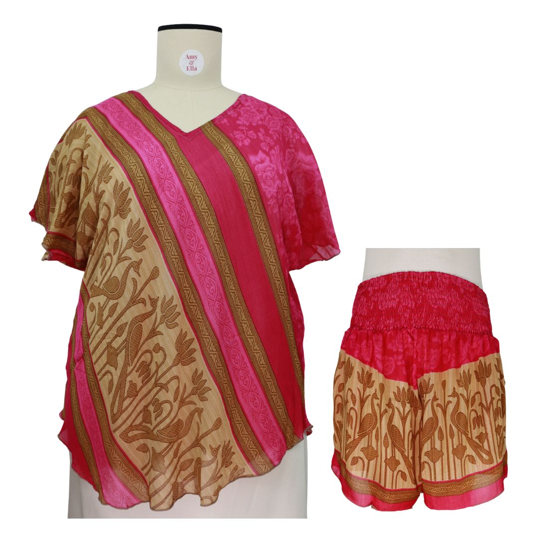 A beautiful set suitable for either sleepwear or lounge wear. Plus, since both pieces are made from the same sari fabrics we use for shorts and blouses, you can also wear the top and shorts separately. The top is very similar to our current short sleeve blouse.