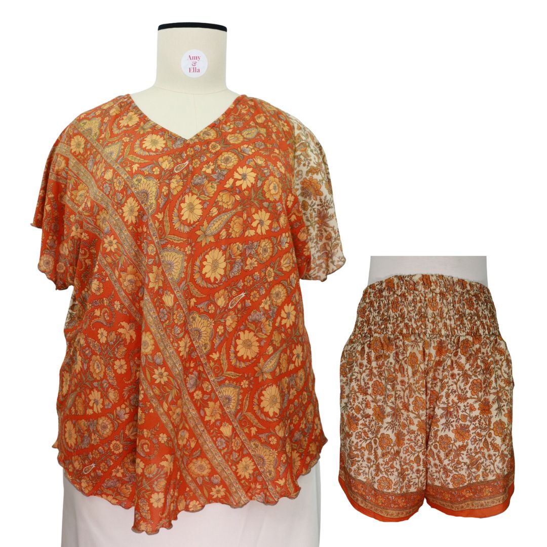 A beautiful set suitable for either sleepwear or lounge wear. Plus, since both pieces are made from the same sari fabrics we use for shorts and blouses, you can also wear the top and shorts separately. The top is very similar to our current short sleeve blouse.