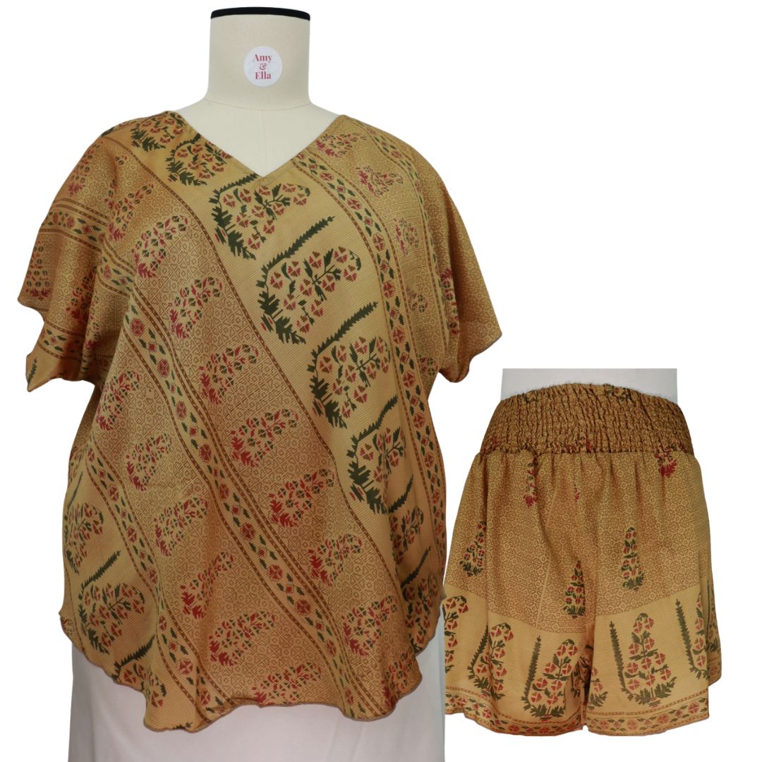 A beautiful set suitable for either sleepwear or lounge wear. Plus, since both pieces are made from the same sari fabrics we use for shorts and blouses, you can also wear the top and shorts separately. The top is very similar to our current short sleeve blouse.