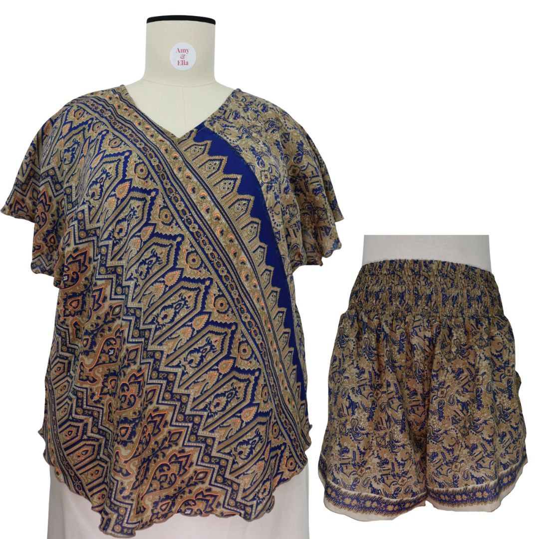 A beautiful set suitable for either sleepwear or lounge wear. Plus, since both pieces are made from the same sari fabrics we use for shorts and blouses, you can also wear the top and shorts separately. The top is very similar to our current short sleeve blouse.
