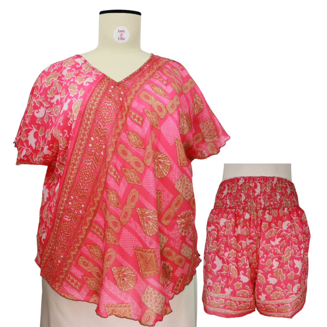 A beautiful set suitable for either sleepwear or lounge wear. Plus, since both pieces are made from the same sari fabrics we use for shorts and blouses, you can also wear the top and shorts separately. The top is very similar to our current short sleeve blouse.