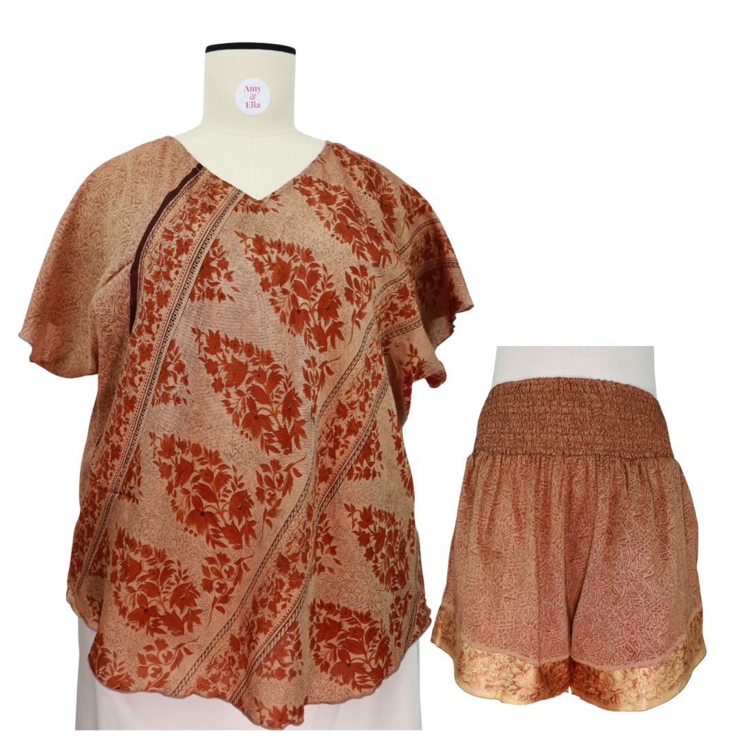 A beautiful set suitable for either sleepwear or lounge wear. Plus, since both pieces are made from the same sari fabrics we use for shorts and blouses, you can also wear the top and shorts separately. The top is very similar to our current short sleeve blouse.