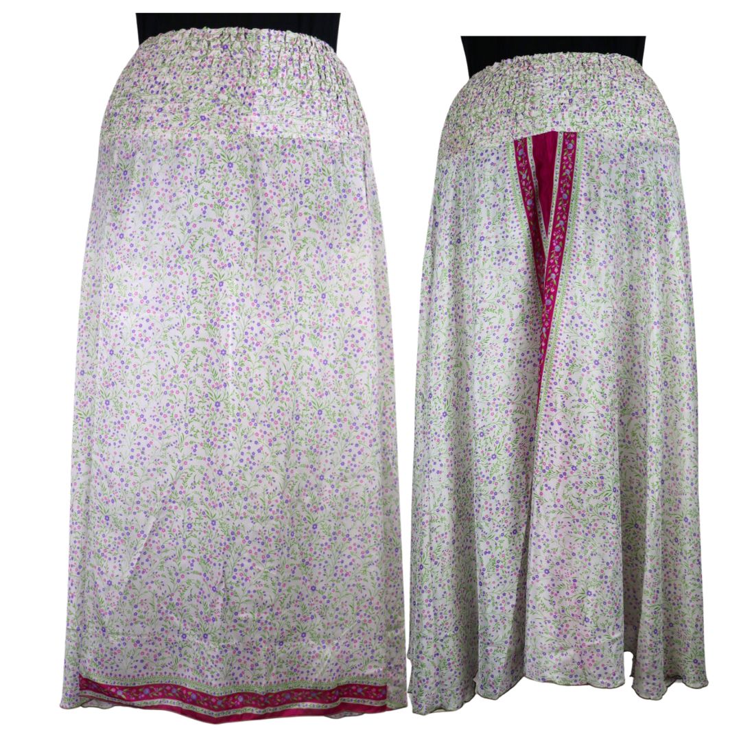Traditionally Saris are often flamboyant and brightly coloured, frequently embroidered, and made from silk, cotton, or, in recent years, synthetic cloth such as viscose and polyester. We use retro Sari cloth in the majority of our garments so silk is a high component. It is not uncommon to find chiffon or georgette added into the mix which is why we refer to the skirts as a silk blend. We also use 'end of roll' sari fabrics.