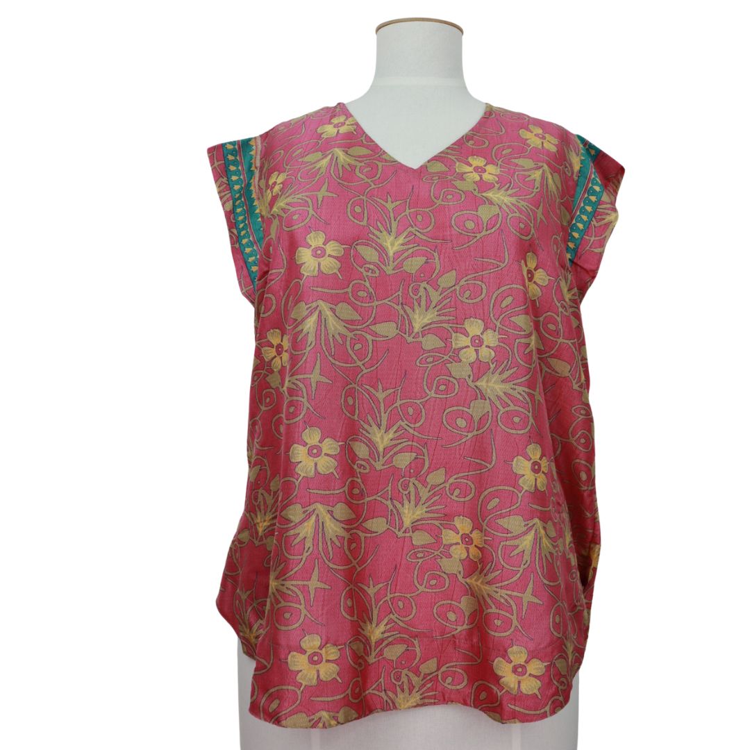 Traditionally Saris are often flamboyant and brightly coloured, frequently embroidered, and made from silk, cotton, or, in recent years, synthetic cloth such as viscose and polyester. We use retro Sari cloth in the majority of our garments so silk is a high component. It is not uncommon to find chiffon or georgette added into the mix which is why we refer to the skirts as a silk blend. We also use 'end of roll' sari fabrics.