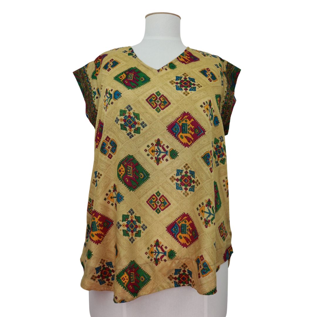 Since we cannot trace back the origin of each Sari we upcycle and each garment is unique (preventing batch testing), it’s impossible to say for sure what the actual fabric content is.
