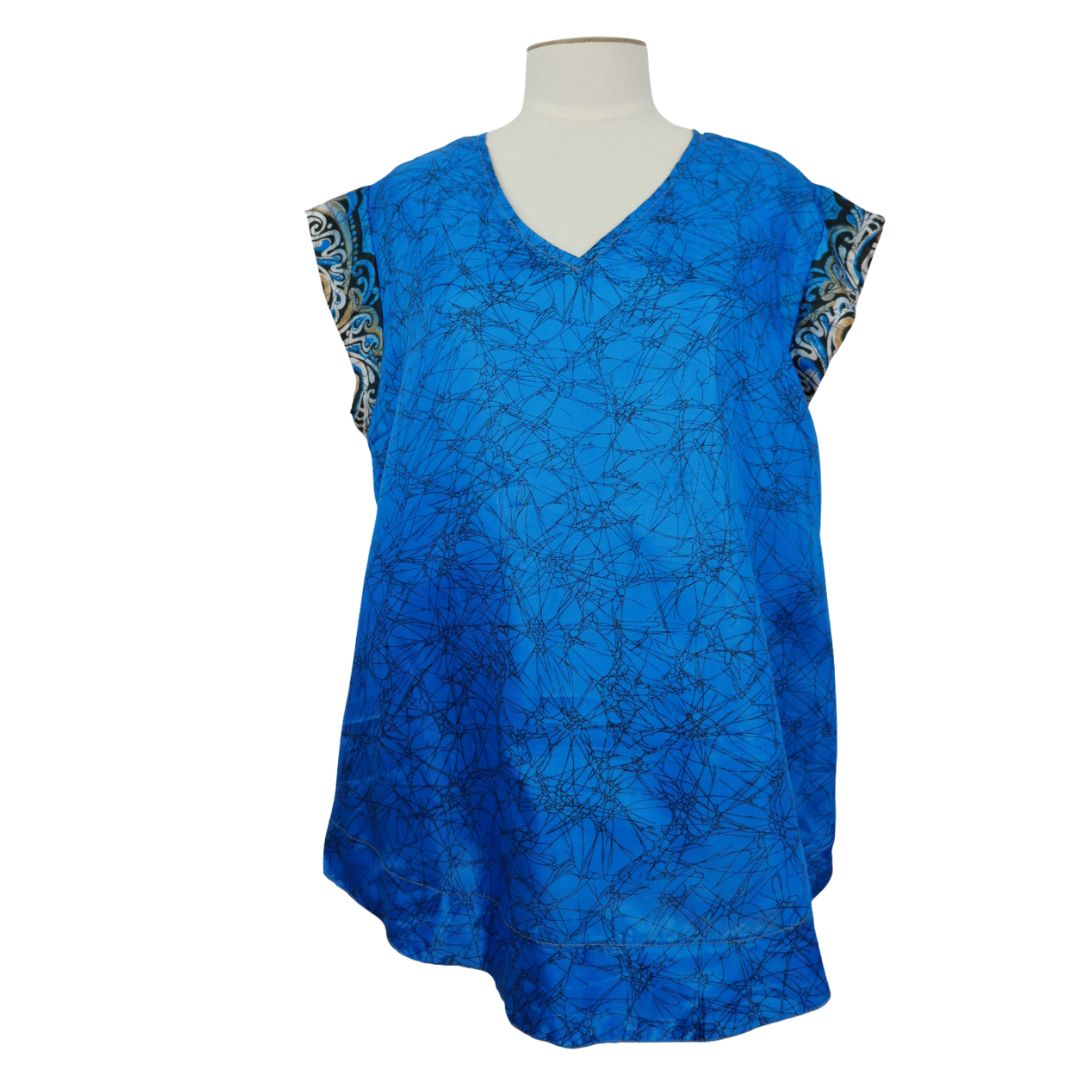 The UNA top measures 58cms (23”) flat across the chest. The length from the nape is approximately 70 cms (27.5”) to the front hem and 75 cms (29.5”) to the rear hem.