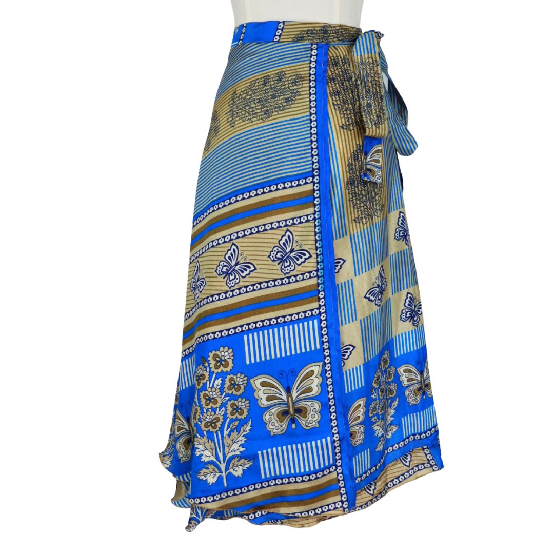 Traditionally Saris are often flamboyant and brightly coloured, frequently embroidered, and made from silk, cotton, or, in recent years, synthetic cloth such as viscose and polyester. We use retro Sari cloth in the majority of our garments so silk is a high component. It is not uncommon to find chiffon or georgette added into the mix which is why we refer to the skirts as a silk blend. We also use 'end of roll' sari fabrics.