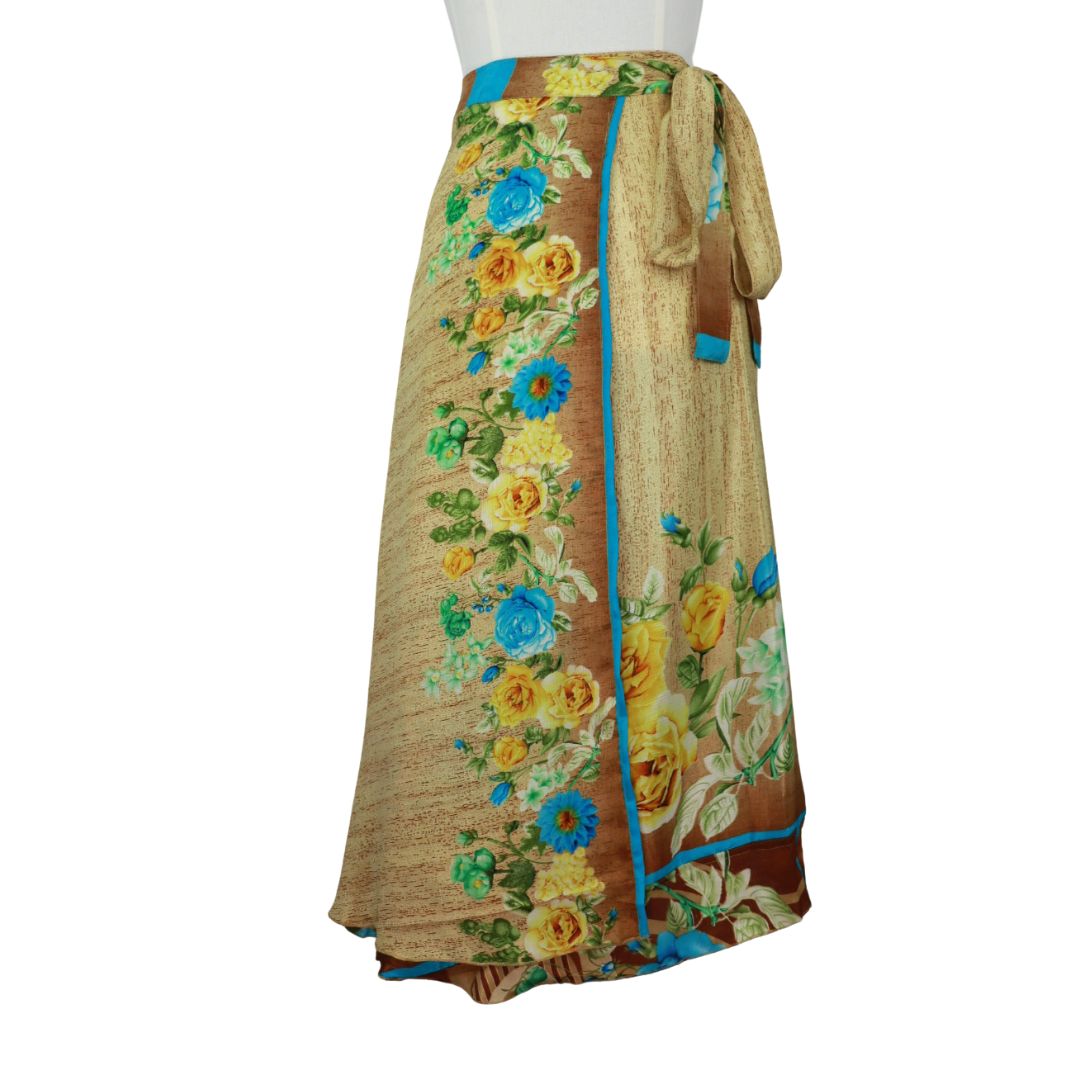 Traditionally Saris are often flamboyant and brightly coloured, frequently embroidered, and made from silk, cotton, or, in recent years, synthetic cloth such as viscose and polyester. We use retro Sari cloth in the majority of our garments so silk is a high component. It is not uncommon to find chiffon or georgette added into the mix which is why we refer to the skirts as a silk blend. We also use 'end of roll' sari fabrics.