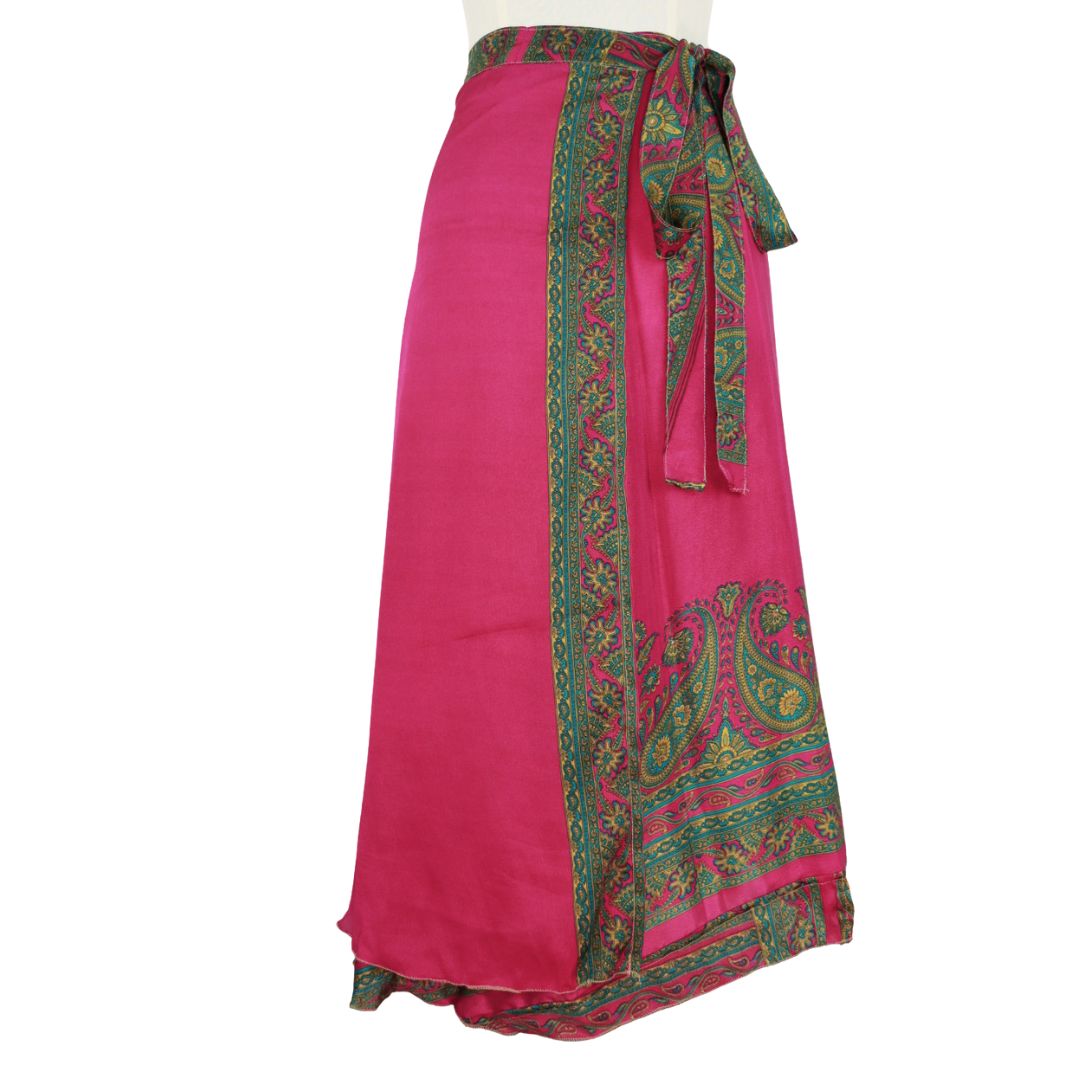 Traditionally Saris are often flamboyant and brightly coloured, frequently embroidered, and made from silk, cotton, or, in recent years, synthetic cloth such as viscose and polyester. We use retro Sari cloth in the majority of our garments so silk is a high component. It is not uncommon to find chiffon or georgette added into the mix which is why we refer to the skirts as a silk blend. We also use 'end of roll' sari fabrics.