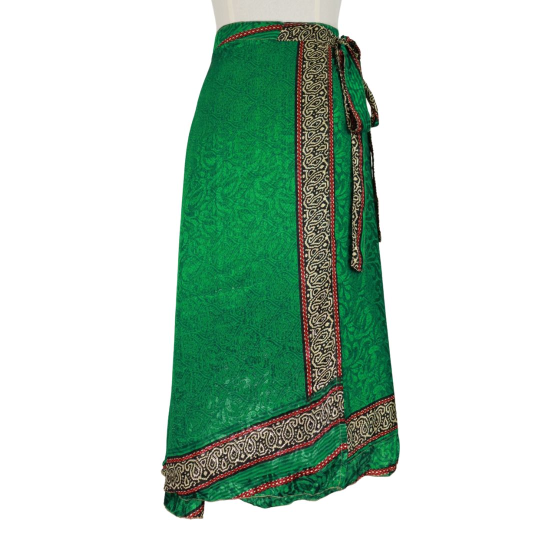 Traditionally Saris are often flamboyant and brightly coloured, frequently embroidered, and made from silk, cotton, or, in recent years, synthetic cloth such as viscose and polyester. We use retro Sari cloth in the majority of our garments so silk is a high component. It is not uncommon to find chiffon or georgette added into the mix which is why we refer to the skirts as a silk blend. We also use 'end of roll' sari fabrics.