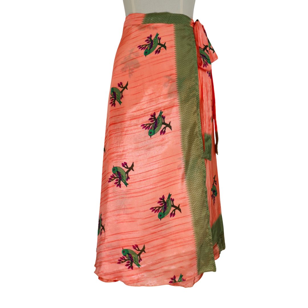 Traditionally Saris are often flamboyant and brightly coloured, frequently embroidered, and made from silk, cotton, or, in recent years, synthetic cloth such as viscose and polyester. We use retro Sari cloth in the majority of our garments so silk is a high component. It is not uncommon to find chiffon or georgette added into the mix which is why we refer to the skirts as a silk blend. We also use 'end of roll' sari fabrics.