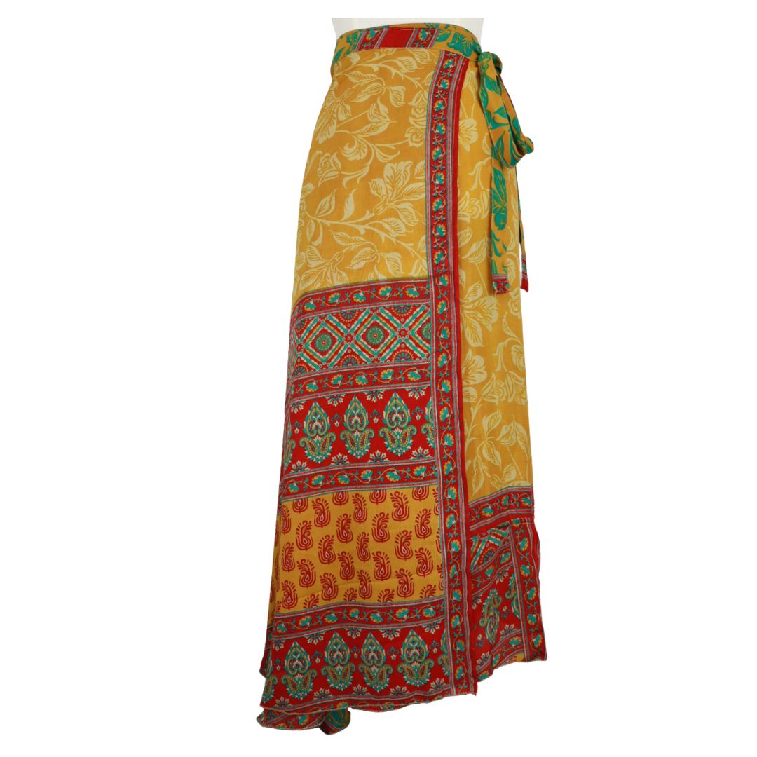 Traditionally Saris are often flamboyant and brightly coloured, frequently embroidered, and made from silk, cotton, or, in recent years, synthetic cloth such as viscose and polyester. We use retro Sari cloth in the majority of our garments so silk is a high component. It is not uncommon to find chiffon or georgette added into the mix which is why we refer to the skirts as a silk blend. We also use 'end of roll' sari fabrics.