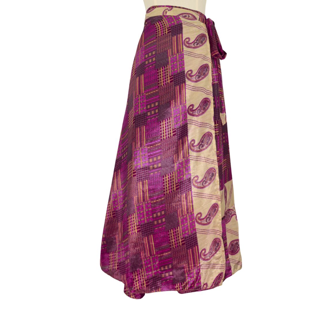 Traditionally Saris are often flamboyant and brightly coloured, frequently embroidered, and made from silk, cotton, or, in recent years, synthetic cloth such as viscose and polyester. We use retro Sari cloth in the majority of our garments so silk is a high component. It is not uncommon to find chiffon or georgette added into the mix which is why we refer to the skirts as a silk blend. We also use 'end of roll' sari fabrics.